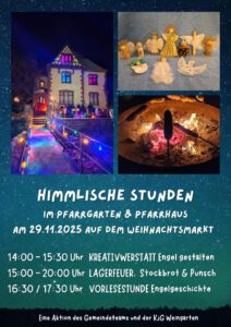 Der Pfarrgarten am Kirchplatz öffnet auch in diesem Jahr während des Weihnachtsmarkts seine Pforten. Ab 13.00 Uhr könnt ihr euch dort bei Glühwein, Kinderpunsch, Lebkuchen und weihnachtlicher Musik…