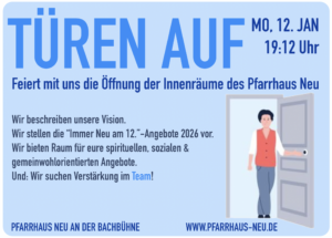 „Türen Auf“ – Öffnung der Innenräume des Pfarrhauses Beim nächsten „Immer neu am 12.“ am 12.01.2026 um 19.12 Uhr öffnen wir die Türen zu den Innenräumen des Pfarrhauses…